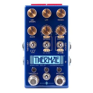 Thermae represents a radically new approach to analog delay and harmonization. The pedal digitally manipulates an analog signal path created by 4 re-issued versions of the legendary MN3005 bucket-brigade delay chips. This creates the ability to change delay time in musically interesting intervals which allows for innumerable options for harmonizing and other sonic madness. These intervals can be sequenced through automatically, or triggered manually for ultimate usability in a musical context. Thermae can also be used as a more standard analog delay with unprecedented analog modulation options. Every knob and switch is connected to a little digital brain while your guitar signal stays 100% analog and never gets digitally processed.