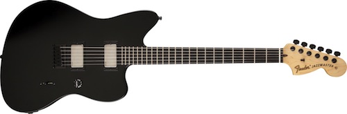 The Jim Root Jazzmaster also features a mahogany body with a comfortable contoured neck heel, satin-finish maple neck with “modern C” profile and large headstock, compound-radius ebony fingerboard (12”-16”) with 22 jumbo frets and no position markers, staggered deluxe locking tuners, black hardware and pickup bezels, and an austere Flat Black satin-nitro lacquer finish. Includes black tweed case with red plush interior, strap and strap locks, cable and polishing cloth.