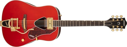 The G5034TFT Rancher is perhaps one of the most distinctive Rancher models ever created, with a beautiful Savannah Sunset gloss finish, a sweet iso-chamber mounted Fideli’Tron™ pickup for great amplified tone and performance, and even a Bigsby® B70G tailpiece with a “wire” trem arm. Other premium features include an arched maple top and back with binding, maple sides, classic Rancher triangular sound hole with binding, mahogany neck, 16-fret rosewood fingerboard with Neo-Classic™“thumbnail” inlays, volume control, “rocking bar” bridge with rosewood base, deluxe tuners, and gold-plated hardware.
