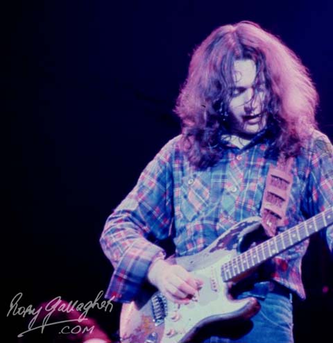 This is a photo of Rory Gallagher playing his well-worn Stratocaster around the time of his Irish Tour '74 album release: